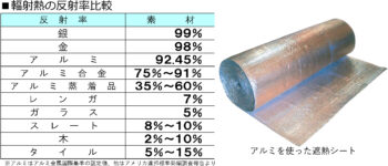 表から「銀」「金」「アルミ」が輻射熱の反射率が高い、つまり輻射熱の移動を防げる素材であることが分かります。