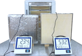 写真は、高性能断熱材で覆った箱と高性能遮熱シートで覆った箱の中にそれぞれ温度計を設置し、ストーブで至近距離から数時間熱をあてたものです。