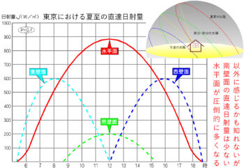 グラフから読み取れるように、夏は圧倒的に水平面が受ける日射量が多くなります。