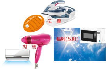 「対流」は空気などが動くことで熱が移動するもので、対流による熱移動を利用している代表的なものが、ドライヤーやエアコンです。
