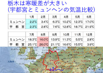 少し古いデータにはなりますが、宇都宮とミュンヘンの月別気温比較表です。
