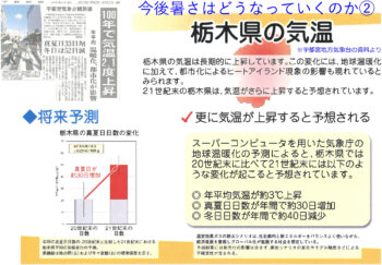 そして、今後の100年で栃木県の年平均気温は更に3℃上昇、真夏日が30日増、冬日が40日減と予想されています。