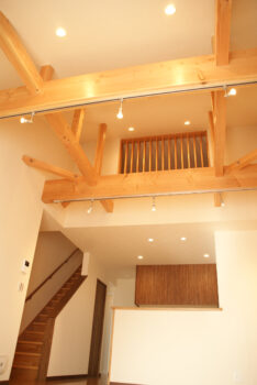 ロフトの壁の一部を格子状にして、リビングダイニングとコミュニケーションを図れるようにしています。