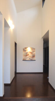 玄関ドアを開けると、正面に奥様お気に入りのニッチ、勾配天井の開放感あふれるホールが広がり、上部にはホールへの明り取り窓が設けられています。