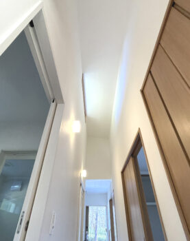 玄関から奥のLDKへと続く長めのホールも、メーターモジュールなので圧迫感をさほど感じなくて済んでいます。